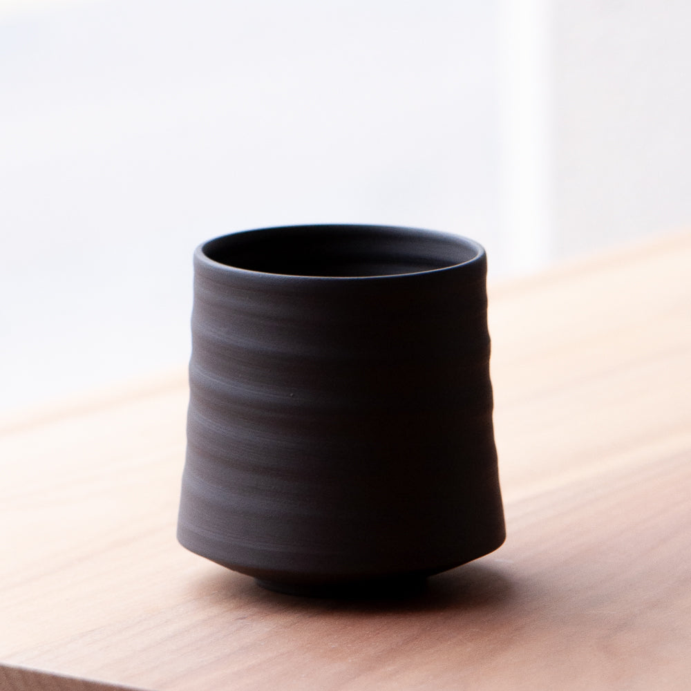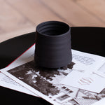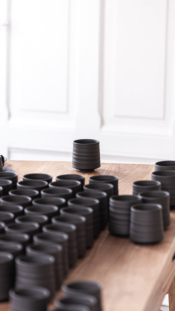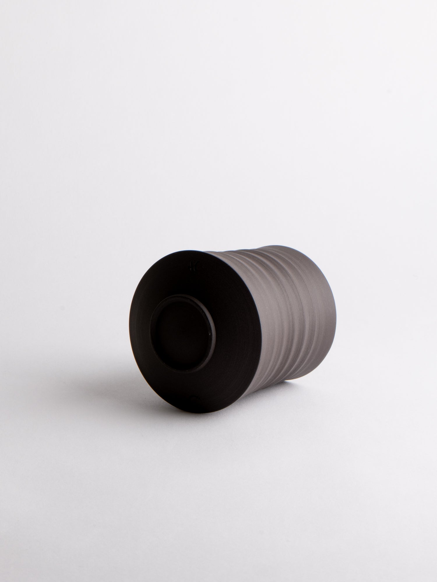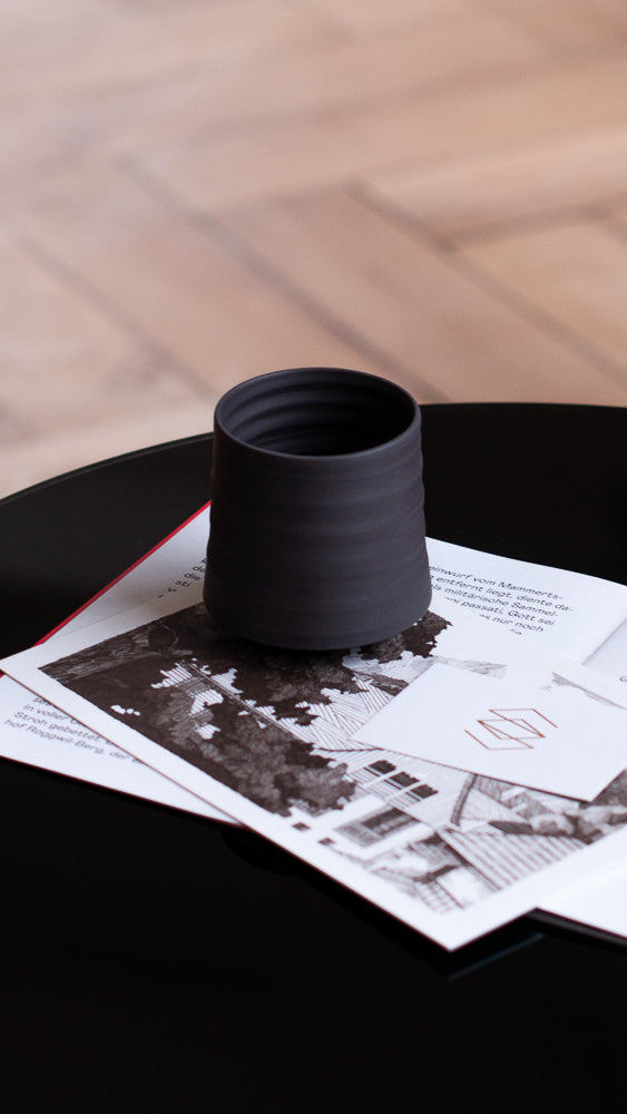A handleless coffee cup made of black porcelain. Slightly more robust at the bottom, so the coffee stays hot for longer while still being easy to grip.