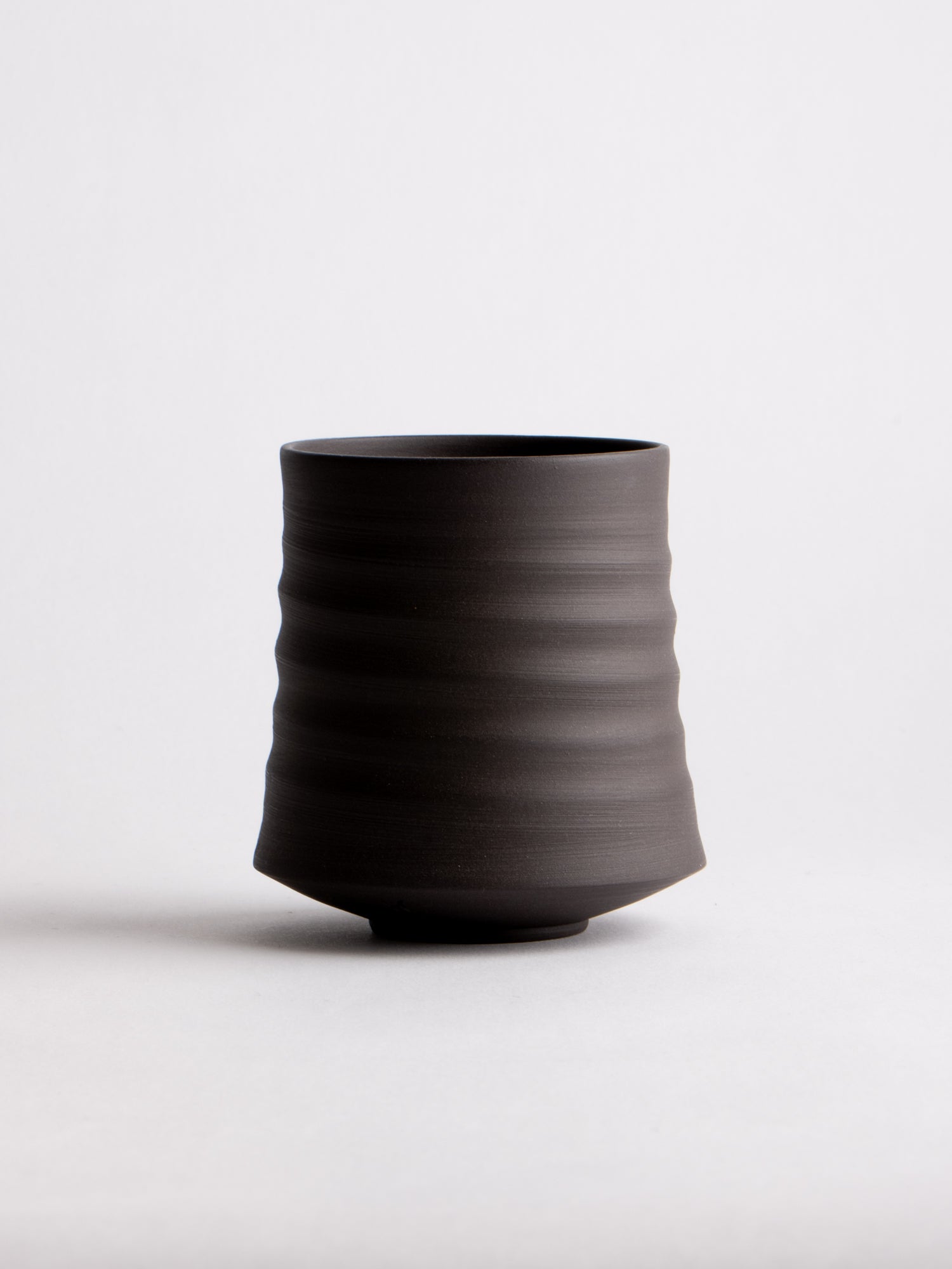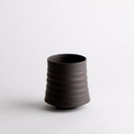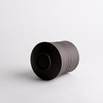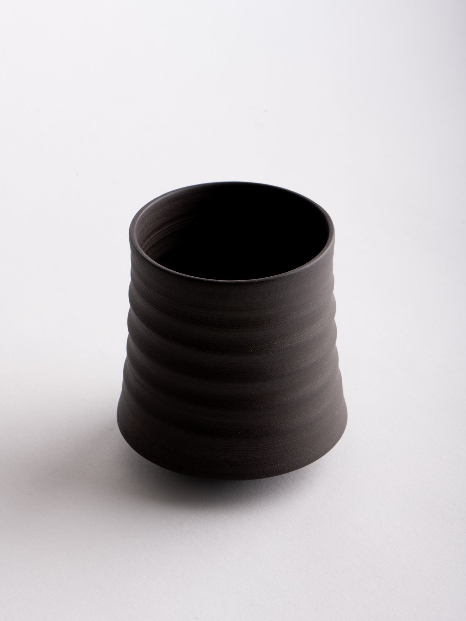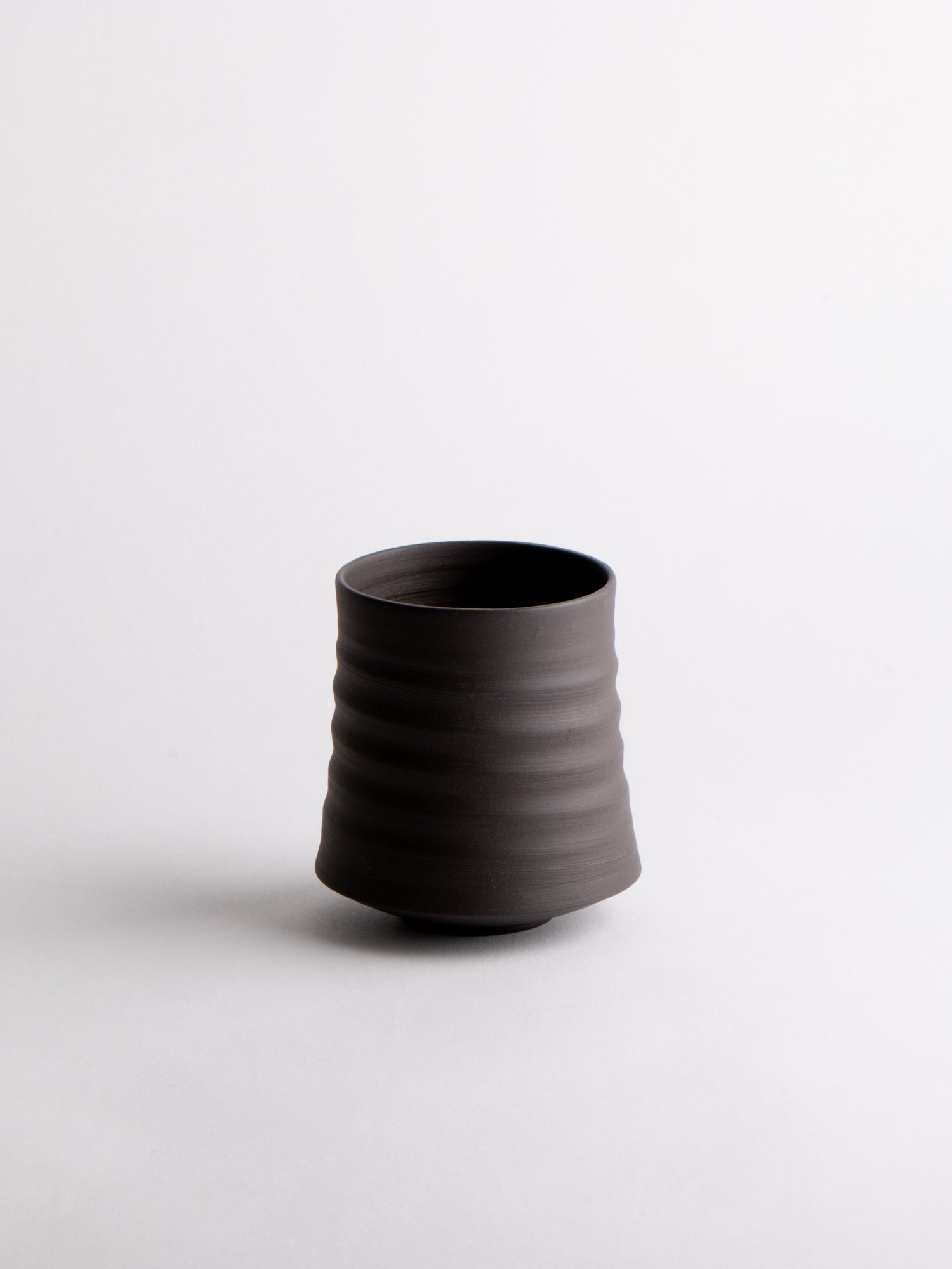 A handleless coffee cup made of black porcelain. Slightly more robust at the bottom, so the coffee stays hot for longer while still being easy to grip.